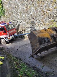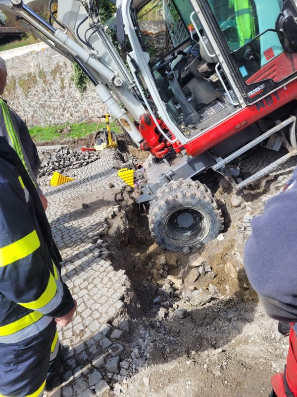 Am Einsatzort in der Nähe der Kirche in Greifenburg war ein Bagger bei Grabungsarbeiten in abschüssigem Gelände ins Rutschen gekommen, weil der Hang vor dem Bagger weggebrochen war.