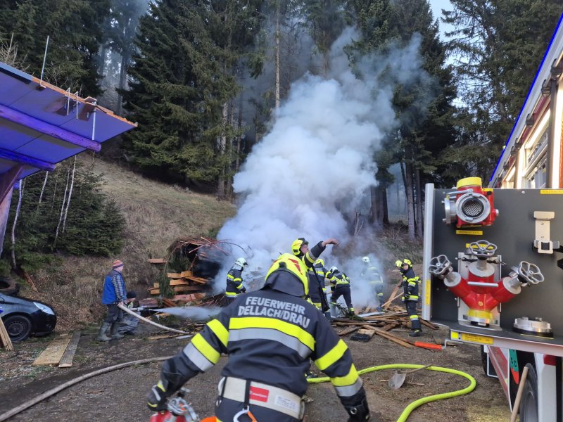 Aber nach der rund 20-minütigen Anfahrt auf über 1250m Seehöhe, sowie der anschließenden Lageerkundung vor Ort war klar, dass ein Holzhaufen Feuer gefangen hatte.