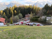 Bereits bei der Erkundung am Einsatzort stellte sich heraus, dass sich das Feuer aufgrund der vorherrschenden Bedingungen rasch ausgebreitet hatte. Betroffen waren neben der ursprünglichen Brandstelle auch der angrenzende Wald, herumliegende Holzteile sowie ein Teil der benachbarten Wiese. Aufgrund dieser Lageentwicklung wurde der Einsatz umgehend zu einem Waldbrand hochgestuft und weitere Feuerwehren zur Unterstützung nachalarmiert.